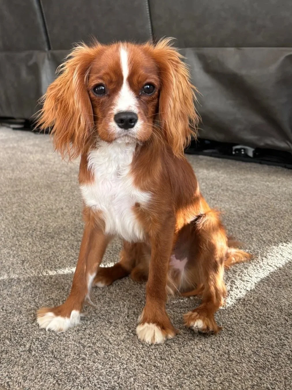 Zena, our stunning and affectionate F1 Cavapoo, was paired with our sweet and striking Miniature Poodle Scamp. Zena is a true gem, loyal, loving, and full of playful charm. She’s the kind of dog who adores her people and brings joy to every room she enters. Scamp adds a fun, confident energy to this pairing with his gentle nature and eye-catching coloring.