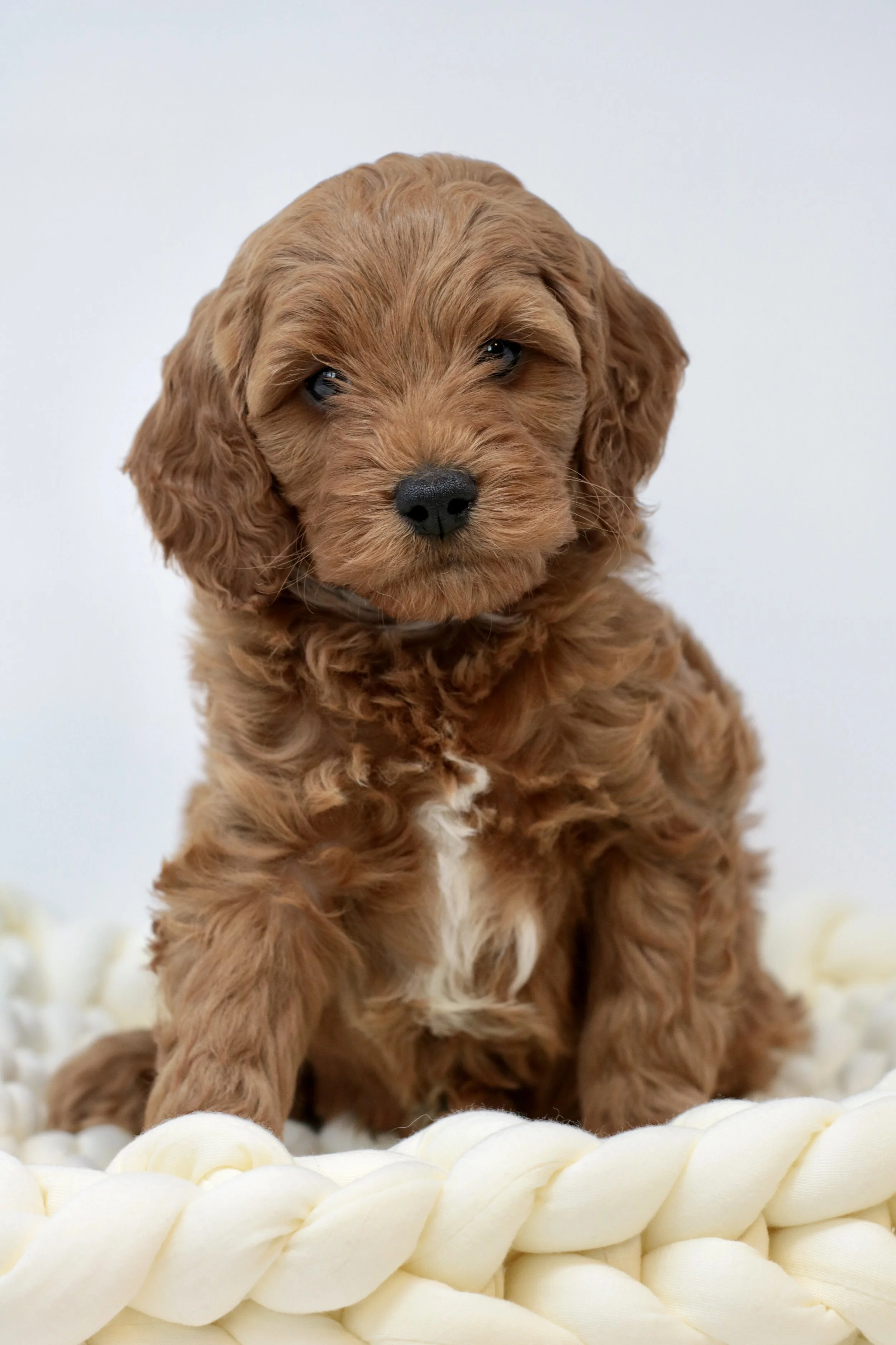 Cavapoos have soft, wavy to curly coats that are low-shedding but require regular grooming. A consistent brushing routine and professional trims every 6–8 weeks will help prevent matting and keep them looking their best.